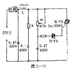 圖2--11電路簡單實用經濟??梢杂米髡{速、調溫等多種用途。該電路的工作原理是常規的阻容移相觸發可控硅,使可控硅的導通角改變以調節負載電流,使相應的負載功能得到調節。調節W即可控制3A 600V