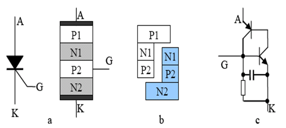 它是由PNPN四層半導(dǎo)構(gòu)成,有三個PN結(jié)、有三個電極(陽極A、陰極K和控制極G)。