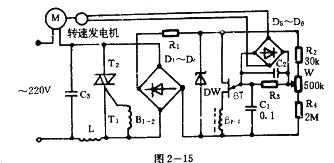 圖2—15所示電路是由雙向可控硅與單結晶體管組成的控制電路。利用轉速發電機進行反饋以維持馬達轉速穩定。 電源經D1~D4組成橋式整流電路,R1與穩壓管DW構成穩壓電路,供給單結晶體管等的工作電壓。此電壓經電阻R2、R4及W分壓作為基準電壓es。轉速發電機產生一個與主馬達轉速成比例的電壓,經D5~D6整流,再經C,濾波,在電阻R3上產生一反饋電壓cv。因此.在電容C1上的控制電壓為基準電壓與反饋電壓之差,即ec=es-eV,用ev。去控制單結管BT