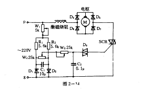 轉(zhuǎn)向控制:電樞M接于D4~D7的整流橋的直流輸出端,流過(guò)它的電流方向不變。激磁繞組接于整流橋之外,改變激磁繞組的電流方向即能改變轉(zhuǎn)動(dòng)方向。由D1、D2、C1、R1、R2、W1、W2及SCR可控硅構(gòu)成轉(zhuǎn)向控制電路。調(diào)節(jié)W2可使SCR可控硅獲得正向或負(fù)向的控制電壓,使電動(dòng)機(jī)正轉(zhuǎn)或反轉(zhuǎn)。 ‘