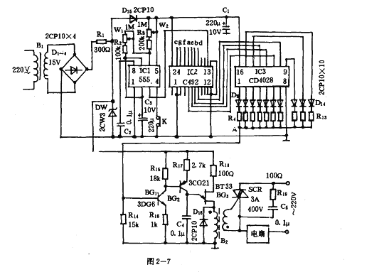 態(tài)多諧振蕩器。其振蕩頻率由R2、R3、W1、W2和C3決定。調(diào)節(jié)W1、W2可改變振蕩頻率和占空比。它產(chǎn)生的方波輸入十進制同步計數(shù)器IC2的CP端(14腳)。IC2產(chǎn)生的A、B、C、D四位二進制碼加到十進制譯碼器IC3的輸入端,IC3的輸出端Qo、Q1,……Q8、Q9隨CP的加入依次呈高電平。IC3的輸出經(jīng)過BG1、BG2、BG3組成的移相網(wǎng)絡(luò)去控制SCR可控硅的導通角,從而控制電機的轉(zhuǎn)速。