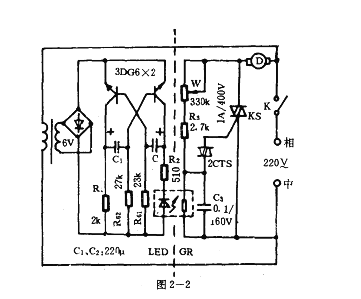 圖2-2虛線右邊電路,GR用2KΩ電阻代替便是常規的調速電路。虛線左邊是多諧振蕩器。用LED與GR組成光電耦合器。接通電源,多諧振蕩器產生振蕩。振蕩電流經發光二極管LED,LED間歇發光,使GR的阻值也時大時小,于是
