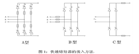 | A型 | 熔短器與每一個元件串聯(lián),能可靠地保護(hù)每一個元件 | IRN<1.57IT | IT:晶閘管通態(tài) 平均電流 |