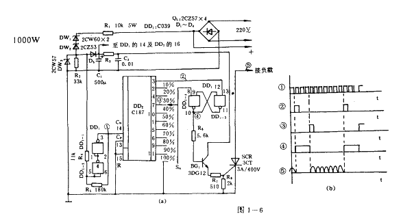 圖1—6中功率調節的原理是:DD1—3和DD1一4構成RS觸發器,觸發器的輸出使BG1導通,從而致使SCR